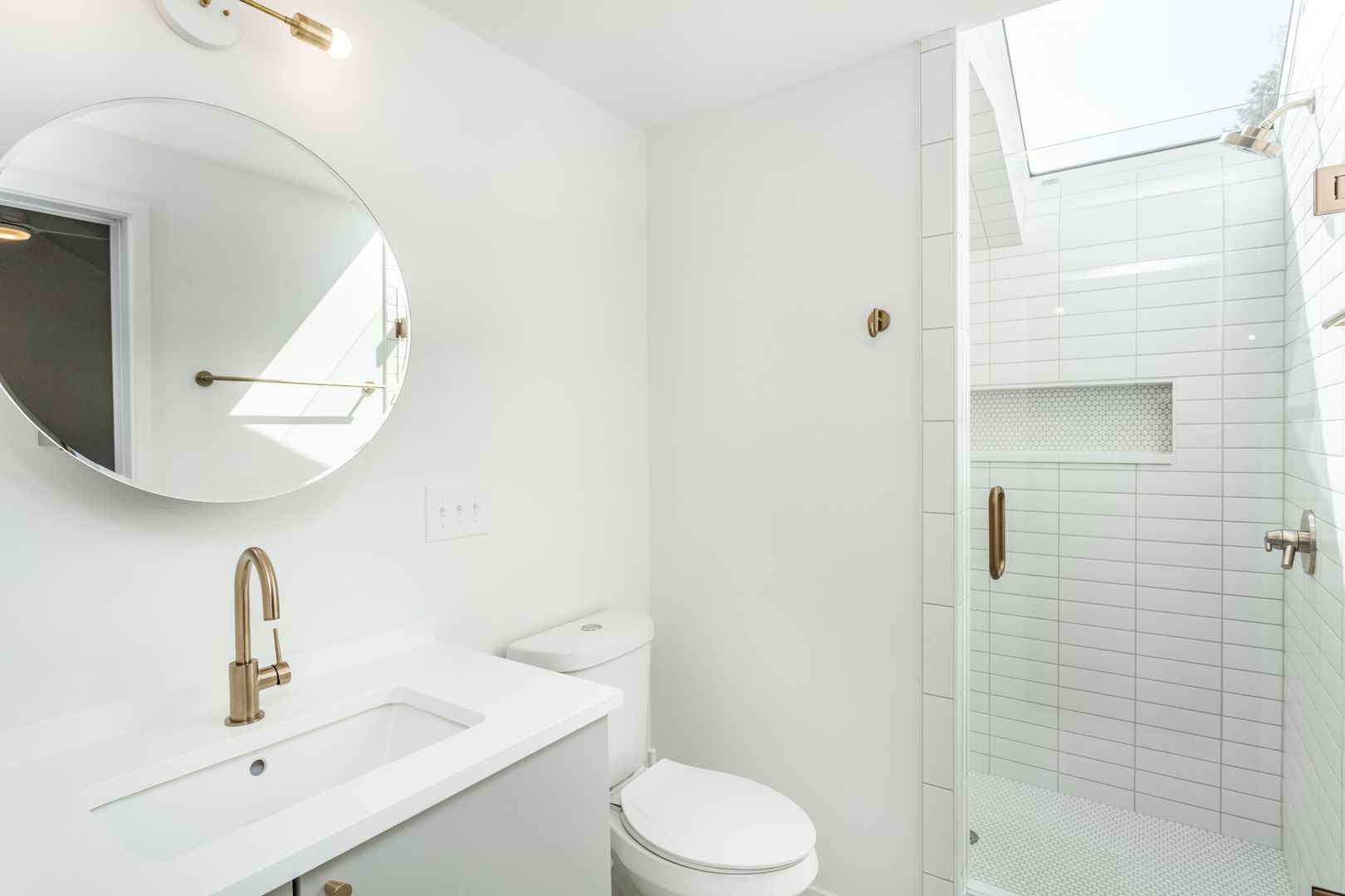 The bathroom features handmade tile and spacious shower with a sky-light.