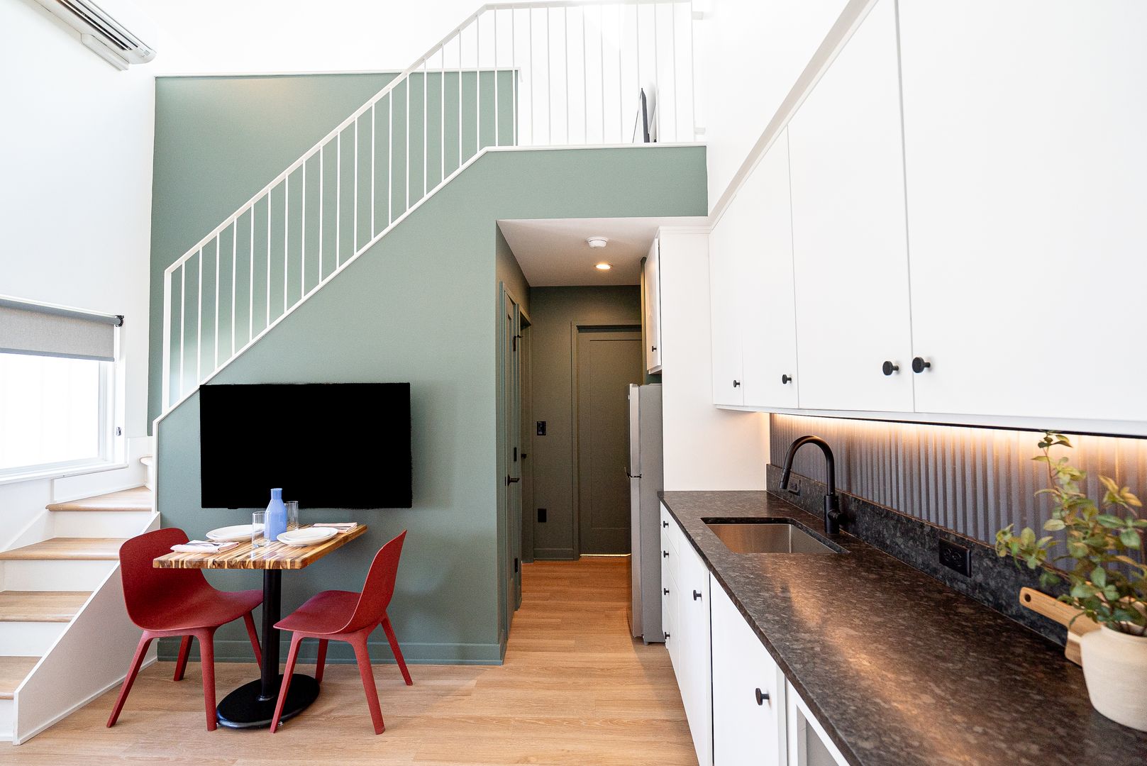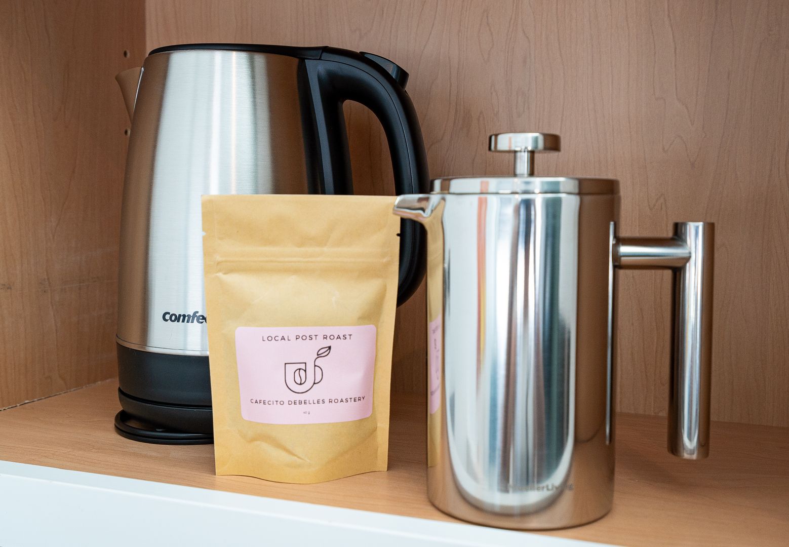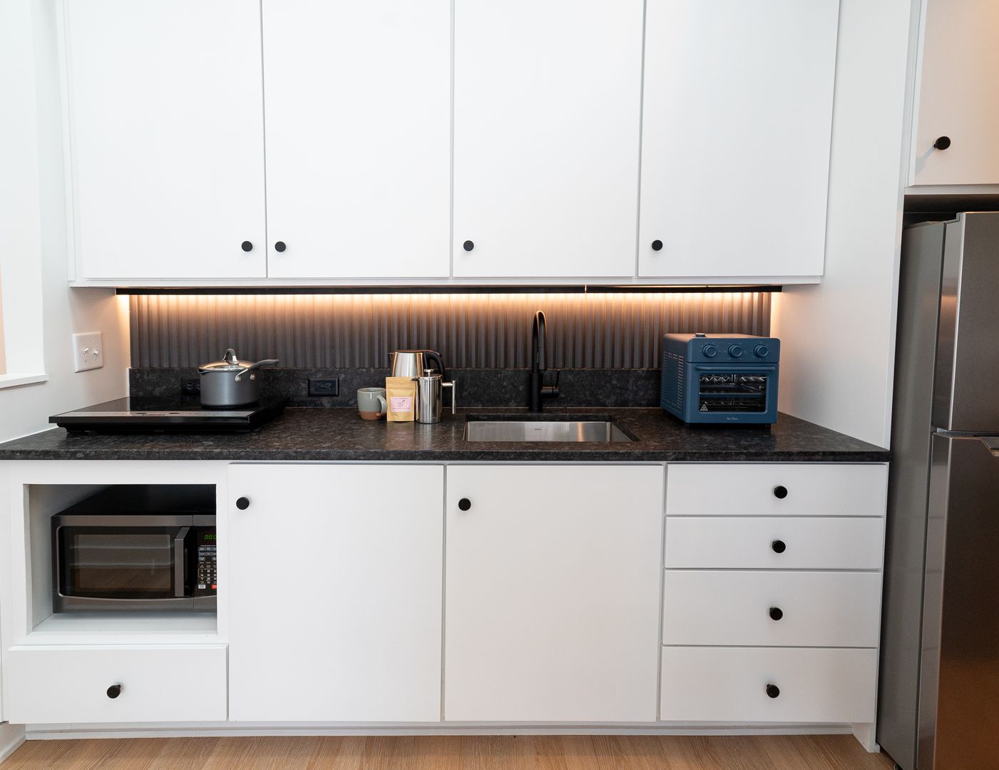 In our flat, you’ll have a well-equipped, eat-in bar with huge prep area, brand new elite appliances, including standing freezer/fridge, 2-burner induction cooktop, counter oven & airfryer, electric kettle, coffee maker (with our Local Post Roast from local coffee roaster, Cafecito).