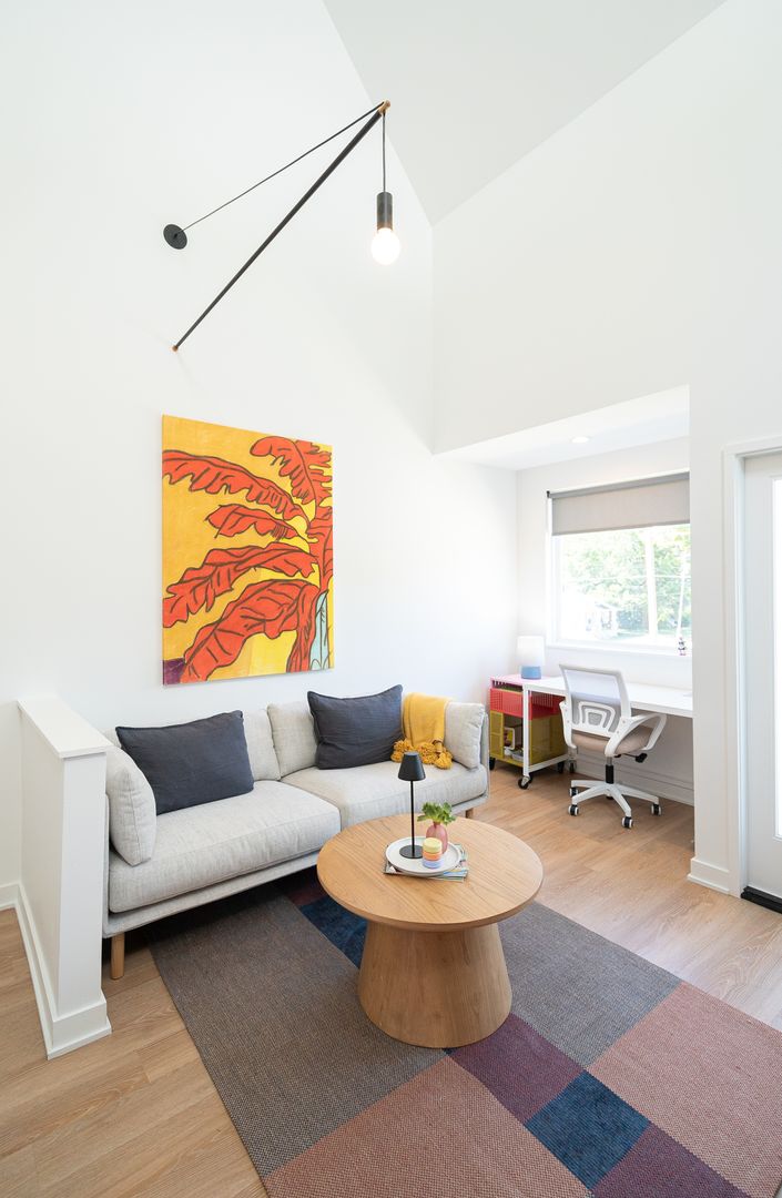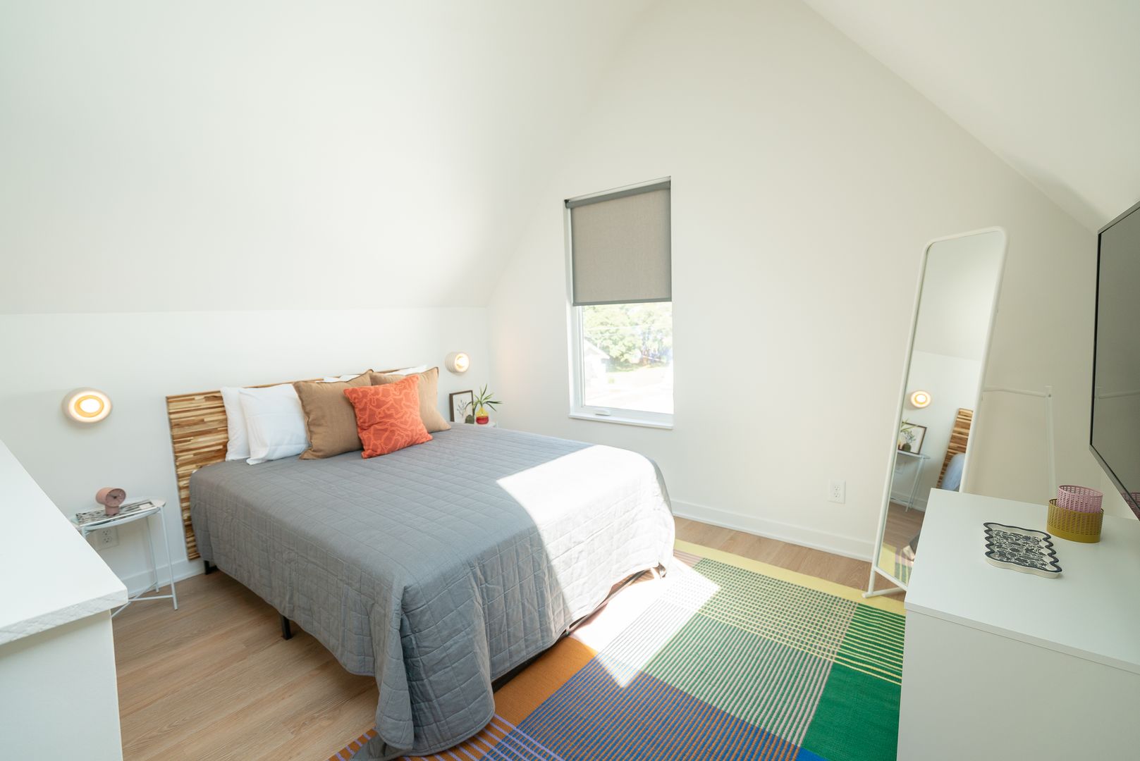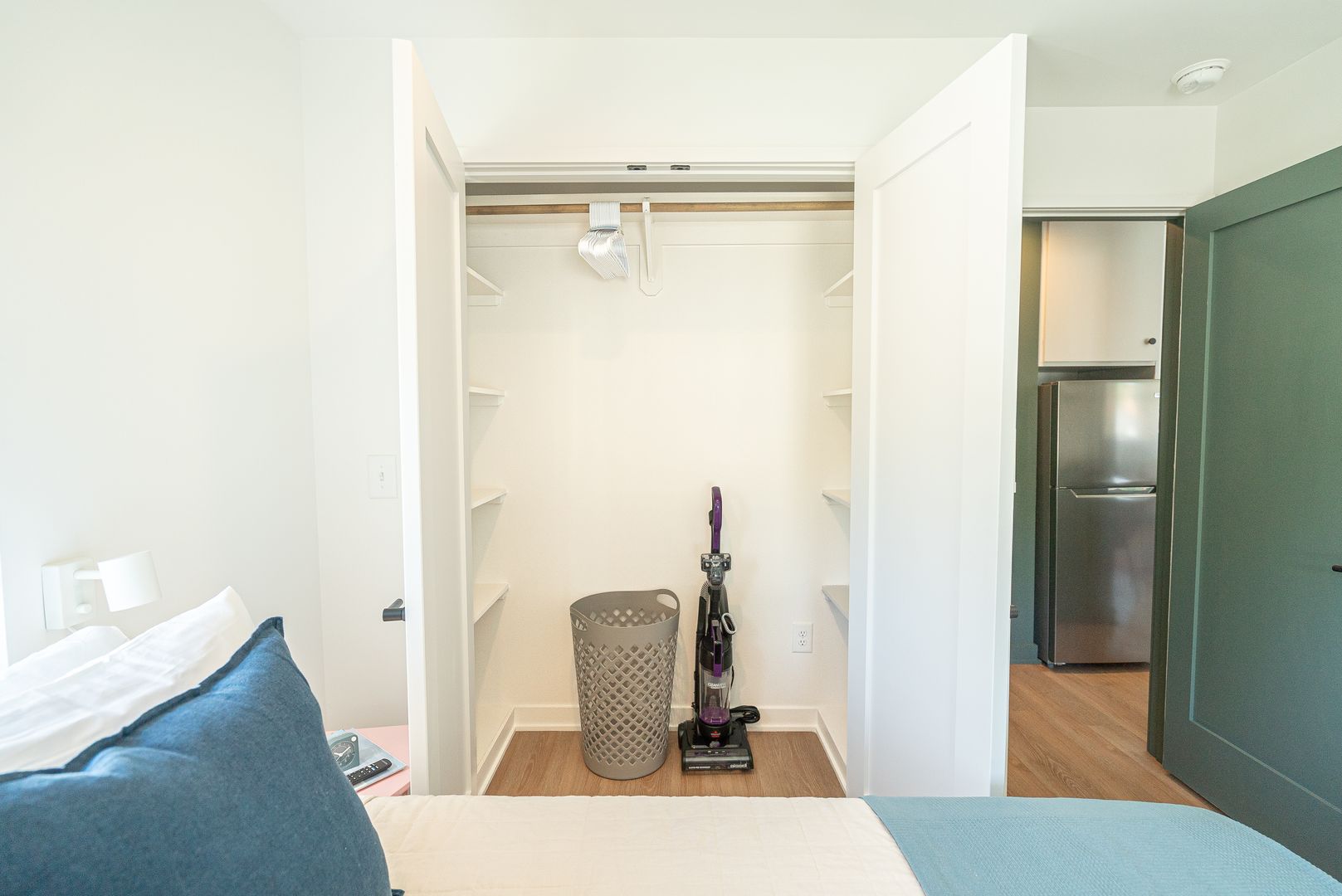 Head upstairs to the sleeping loft for the second bedroom. You’ll find plenty of storage, so you can settle in comfortably. There’s a dresser and hidden hanging storage, cleverly tucked behind the standing floor mirror. It’s a peaceful, well-thought out space.